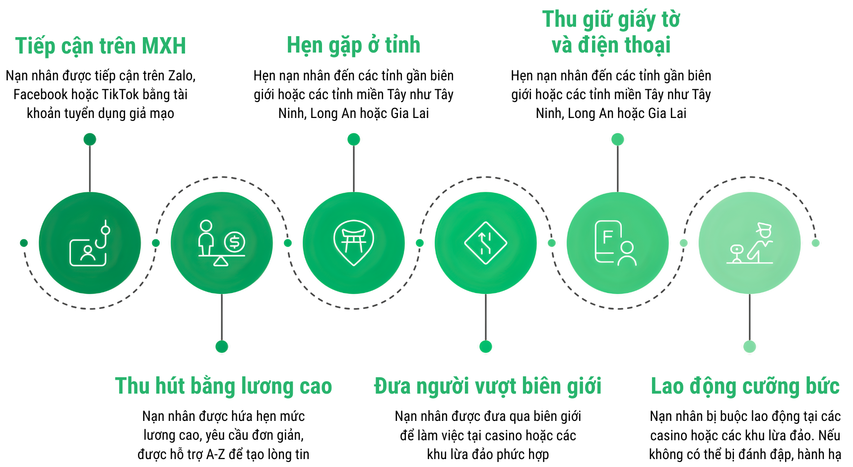 - Hẹn nạn nhân đến các tỉnh gần biên giới hoặc các tỉnh miền Tây như Tây Ninh, Long An hoặc Gia Lai để “đưa sang công ty làm việc”.
